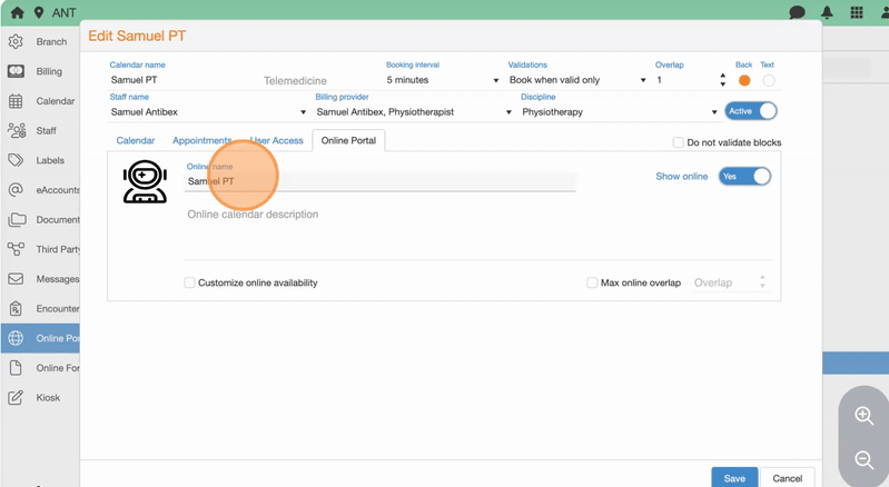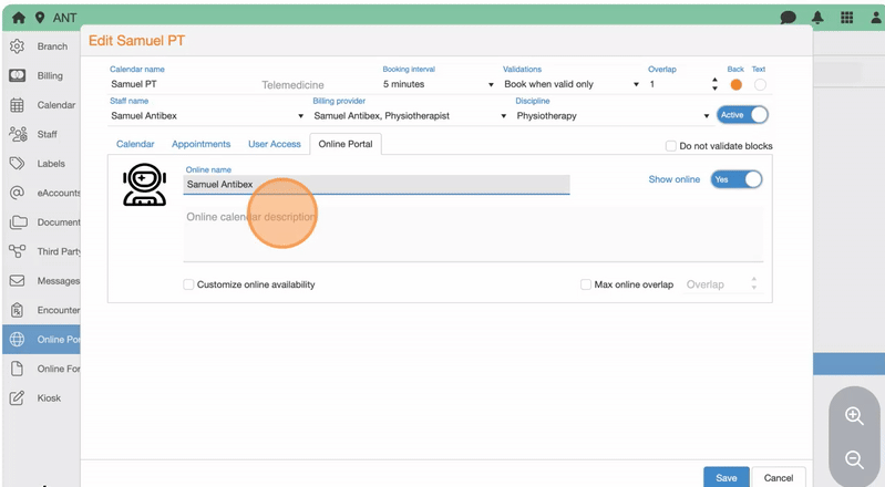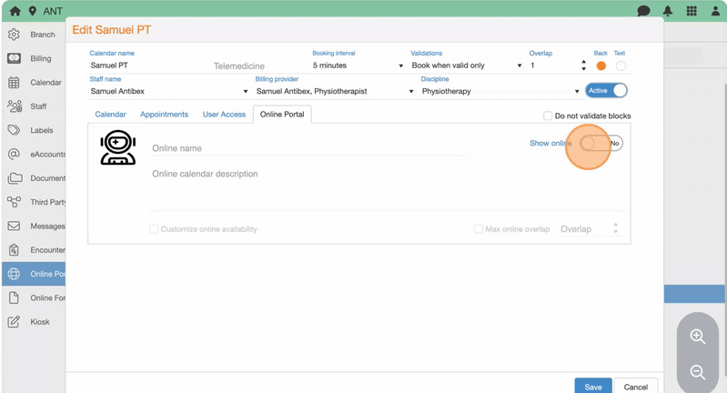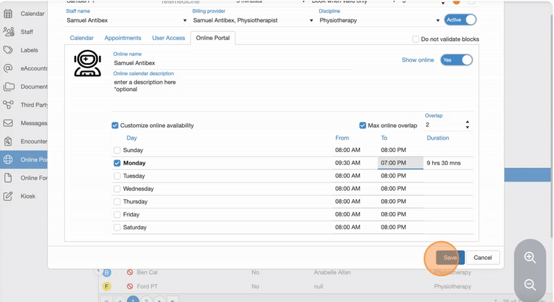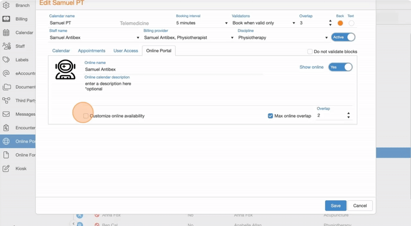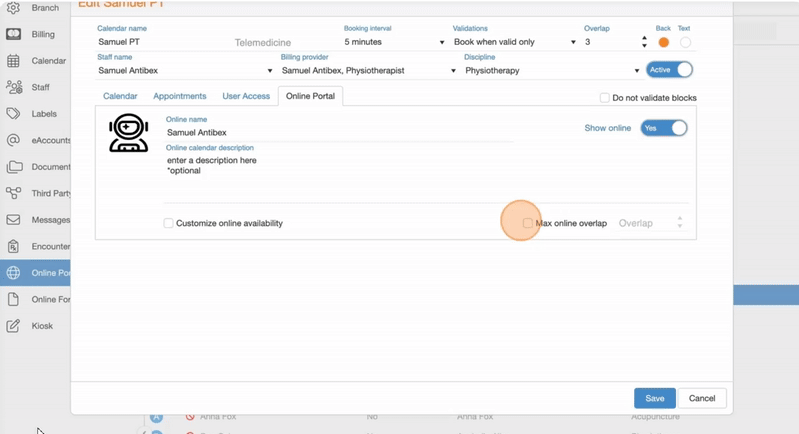 27. Check Max online overlap and adjust the Overlap value (i.e., how many appointments can be booked in the same time slot) to limit concurrent bookings, if different from the default calendar settings.