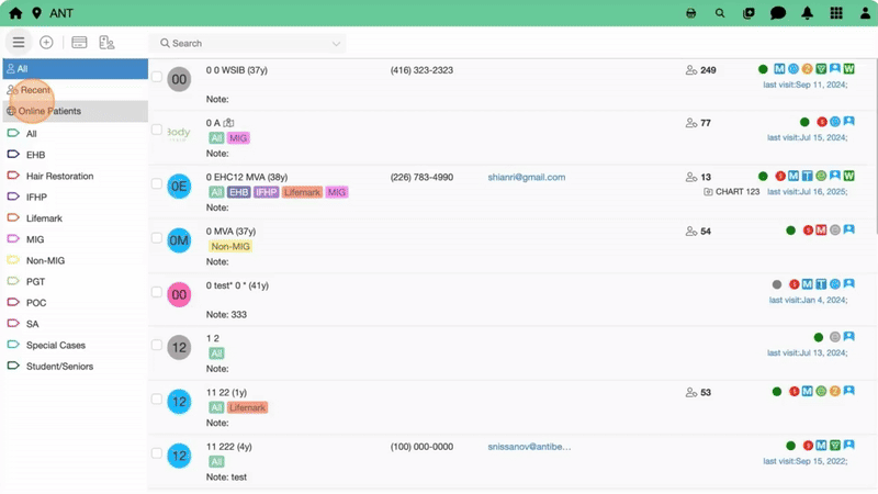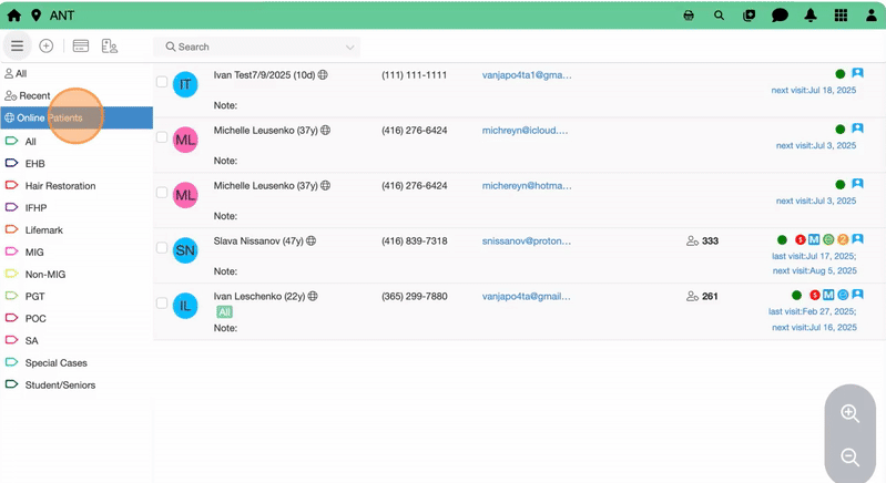 - In Online Patients you will see: